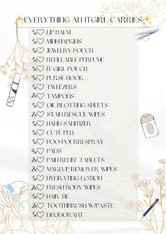 This pouch is filled with everyday essentials to keep you feeling confident, fresh, and prepared wherever you go. From beauty must-haves like lip balm, perfume, and blotting sheets, to hygiene items like hand sanitizer, wipes, and deodorant, plus little lifesavers like a purse hook, tweezers, and pain relief. It even includes feminine care, a mini toothbrush kit, and more, because being that girl means always being ready for anything.